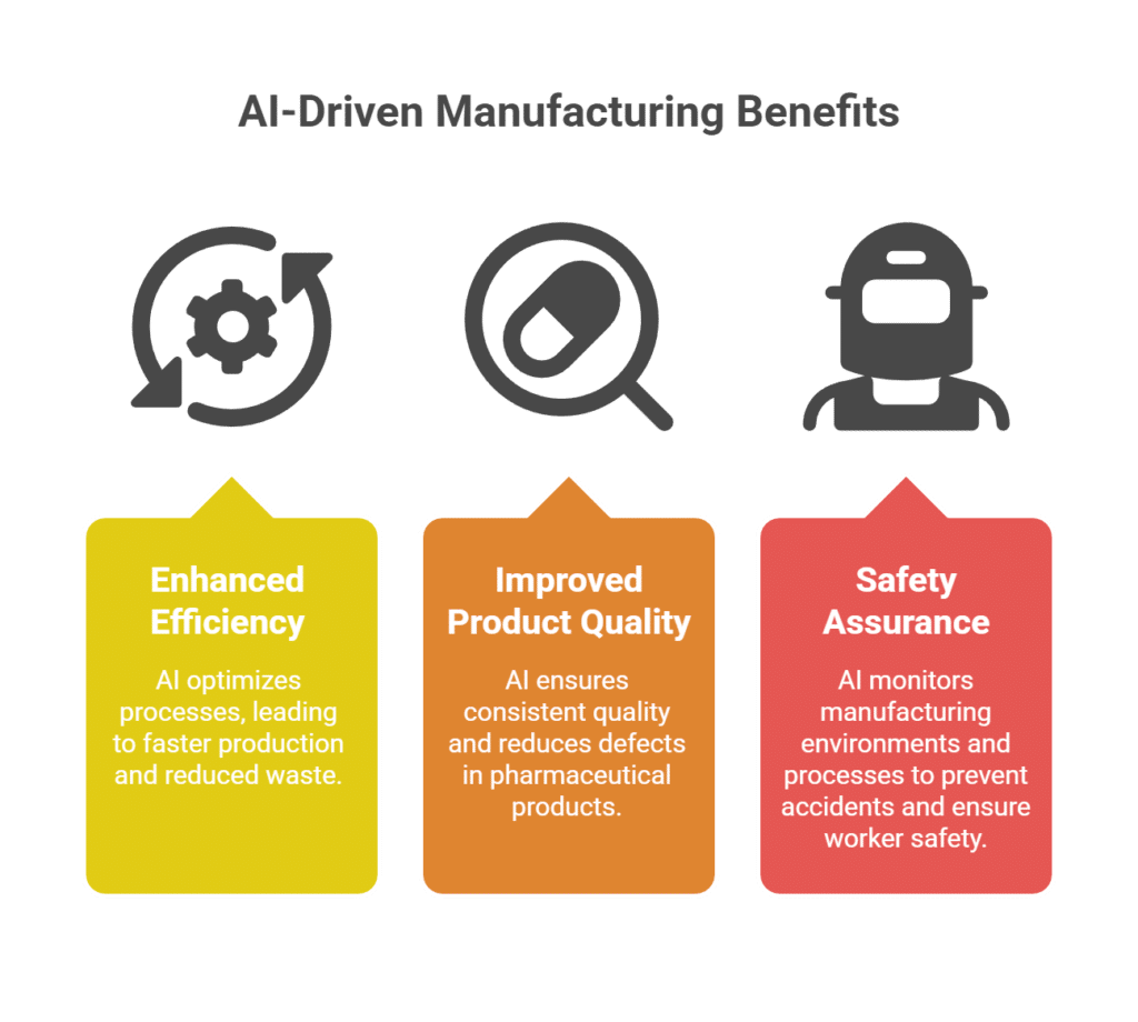 While drug discovery captures headlines, the real operational transformation is happening in manufacturing. AI is providing end-to-end support in pharmaceutical manufacturing through enhanced efficiency, improved product quality, and safety assurance. According to McKinsey, AI-driven analytics can significantly maximize yield, ensuring patients receive critical medicines faster while improving the cost and sustainability of manufacturing operations. [8]